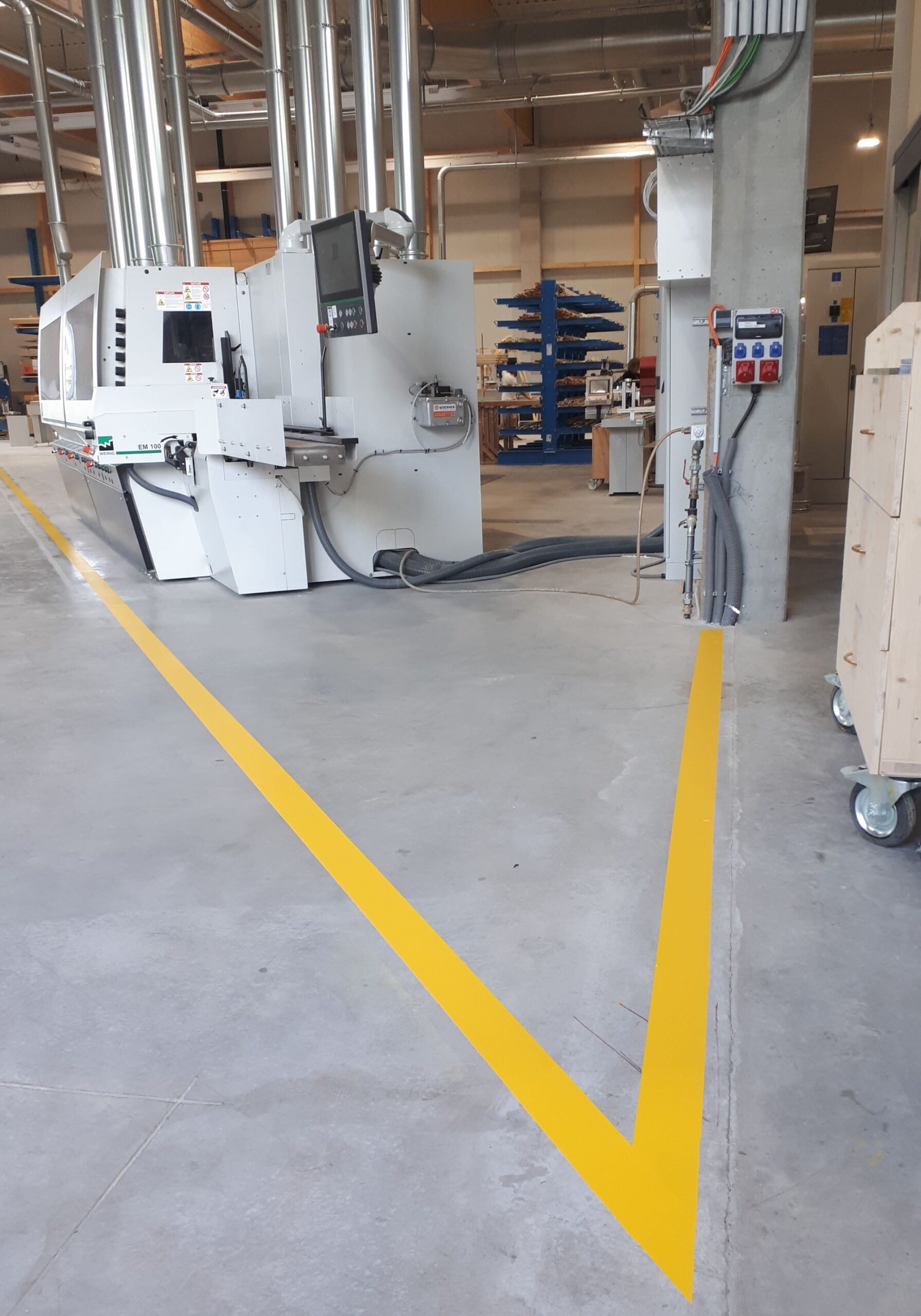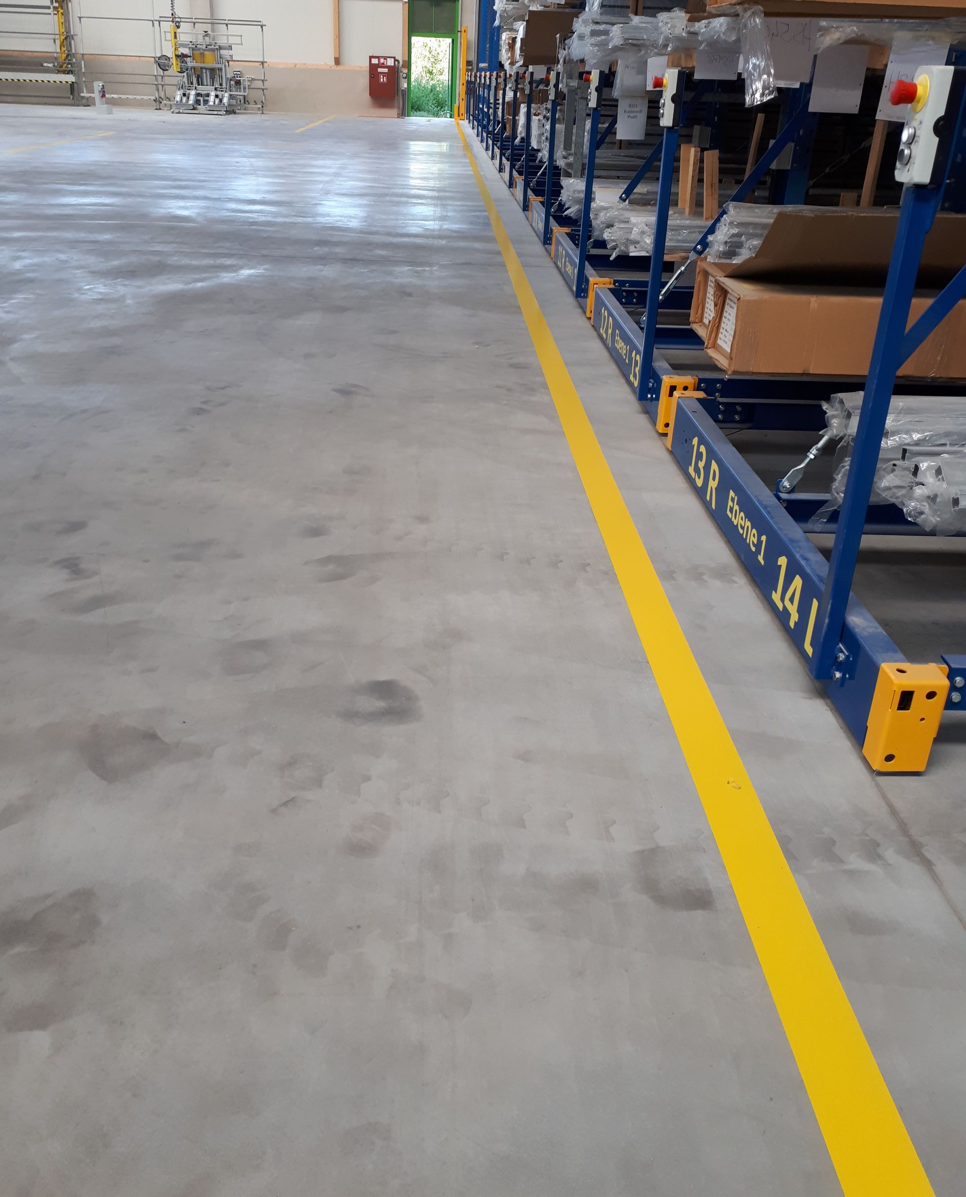 Verkehrsgelbe Strichmarkierung in neuer Industriehalle in Deutschland.