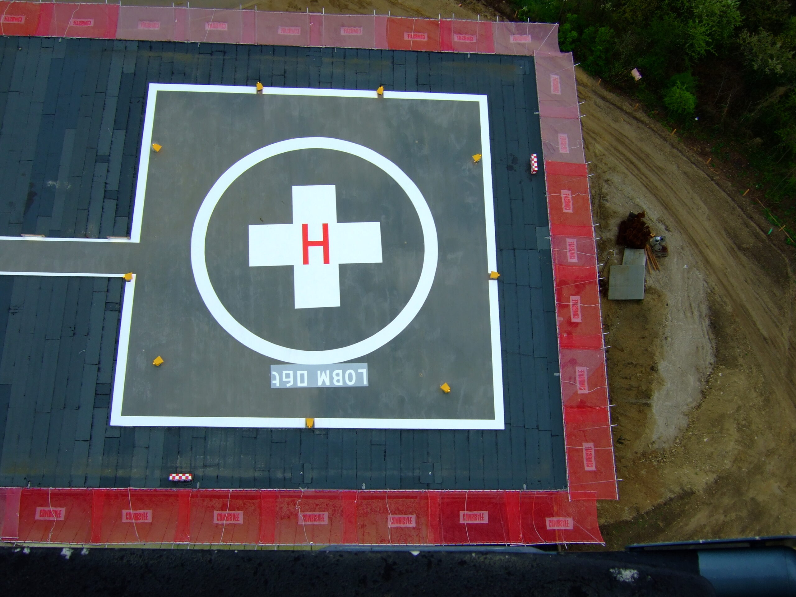 Pistenrandmarkierung für Hubschrauberlandeplatz neben einem Krankenhaus.