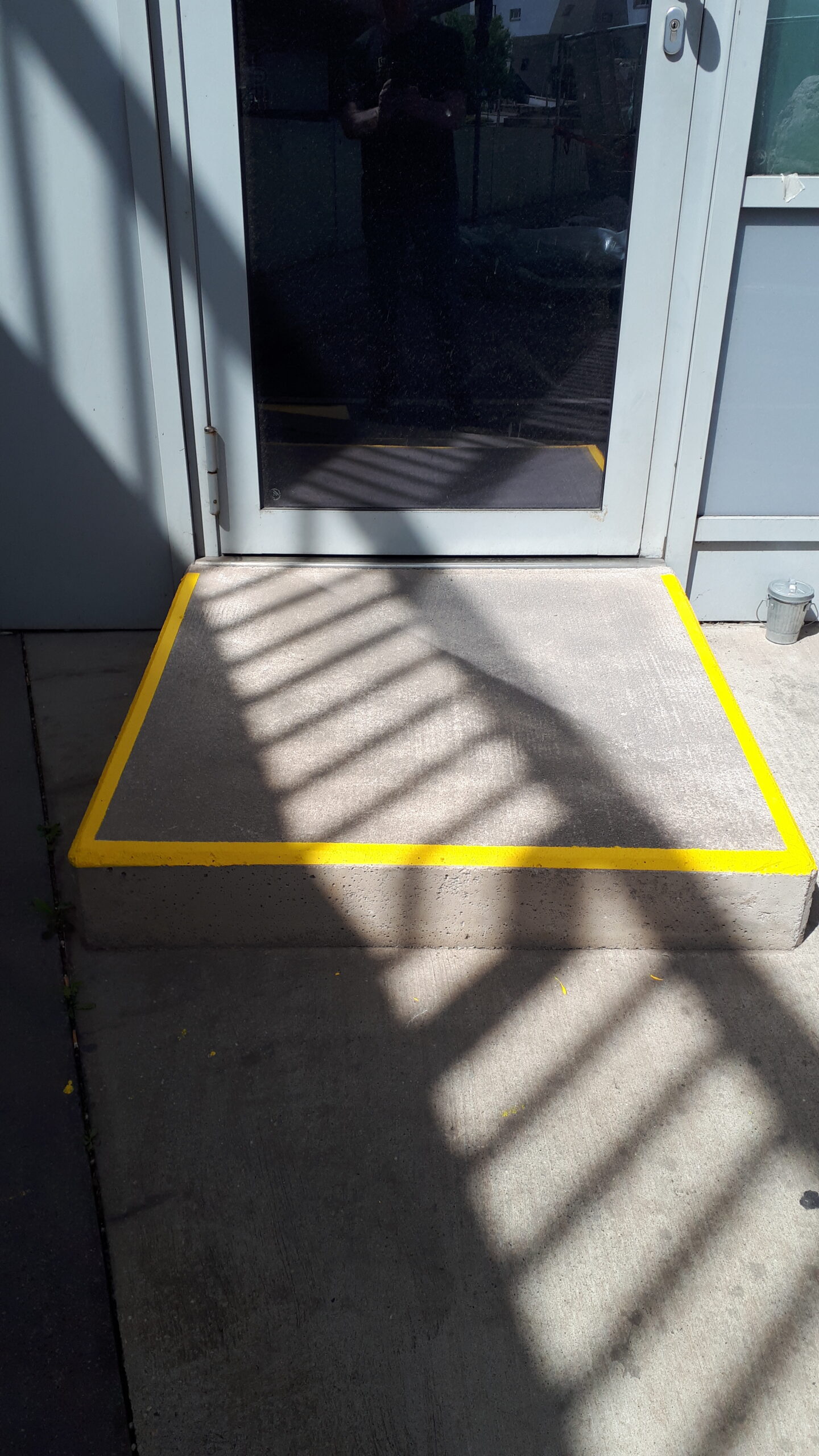 Betonpodest als hohe Stolpergefahr. Kantenmarkierungen bringen Sicherheit.