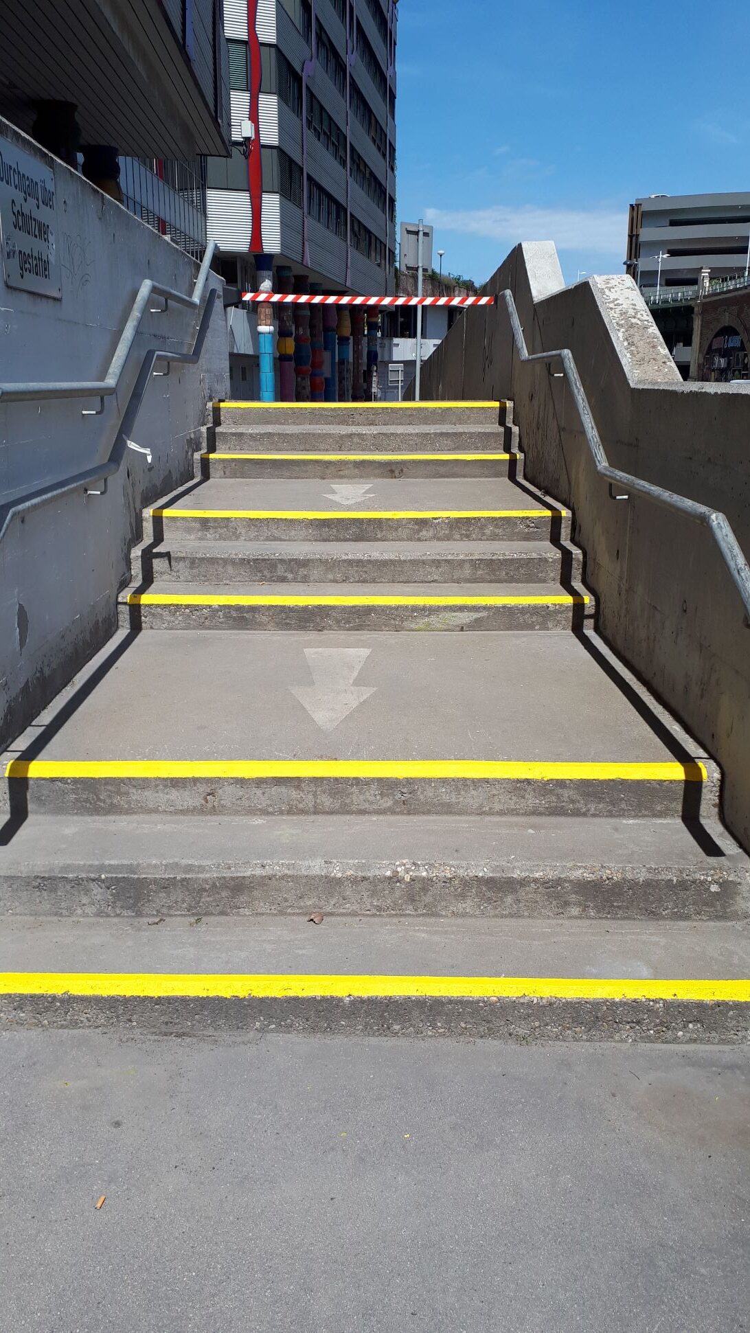 Warnen Sie vor Gefahrenstellen. Bei Stufen ist oft Stolpergefahr gegeben. Überhaupt wenn Sie höher als 22cm sind. Deshalb werden Stufenkanten in Signalfarbe „zart“ markiert. Jedoch nur die Draufsicht. Warnmarkierungen sind schwarz-gelbe 45 Grad Markierungen, die an hervortretenden Stellen angebracht werden.