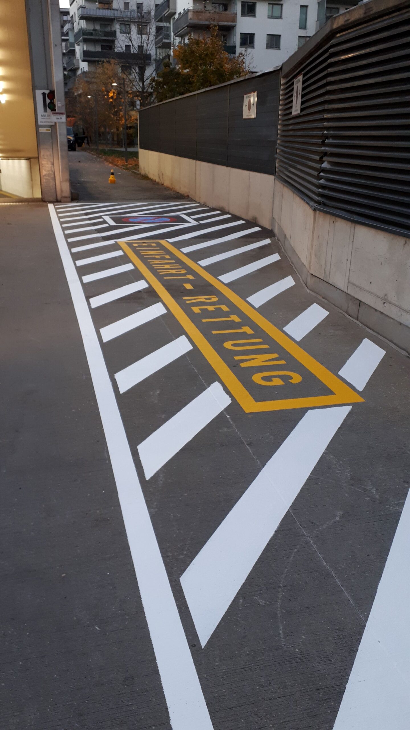 Sperrflächen mit Schraffuren mit 30cm Schrift für eine Rettungseinfahrt.