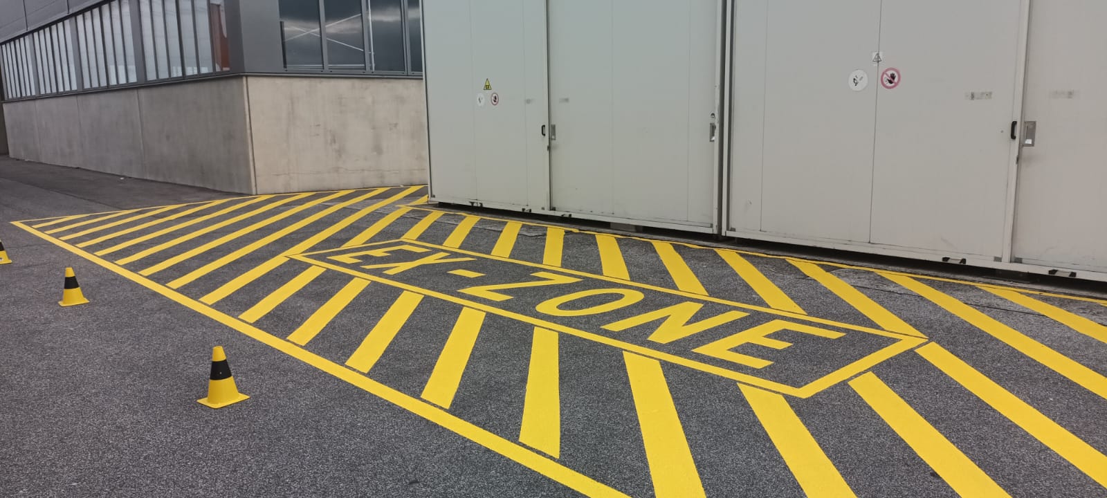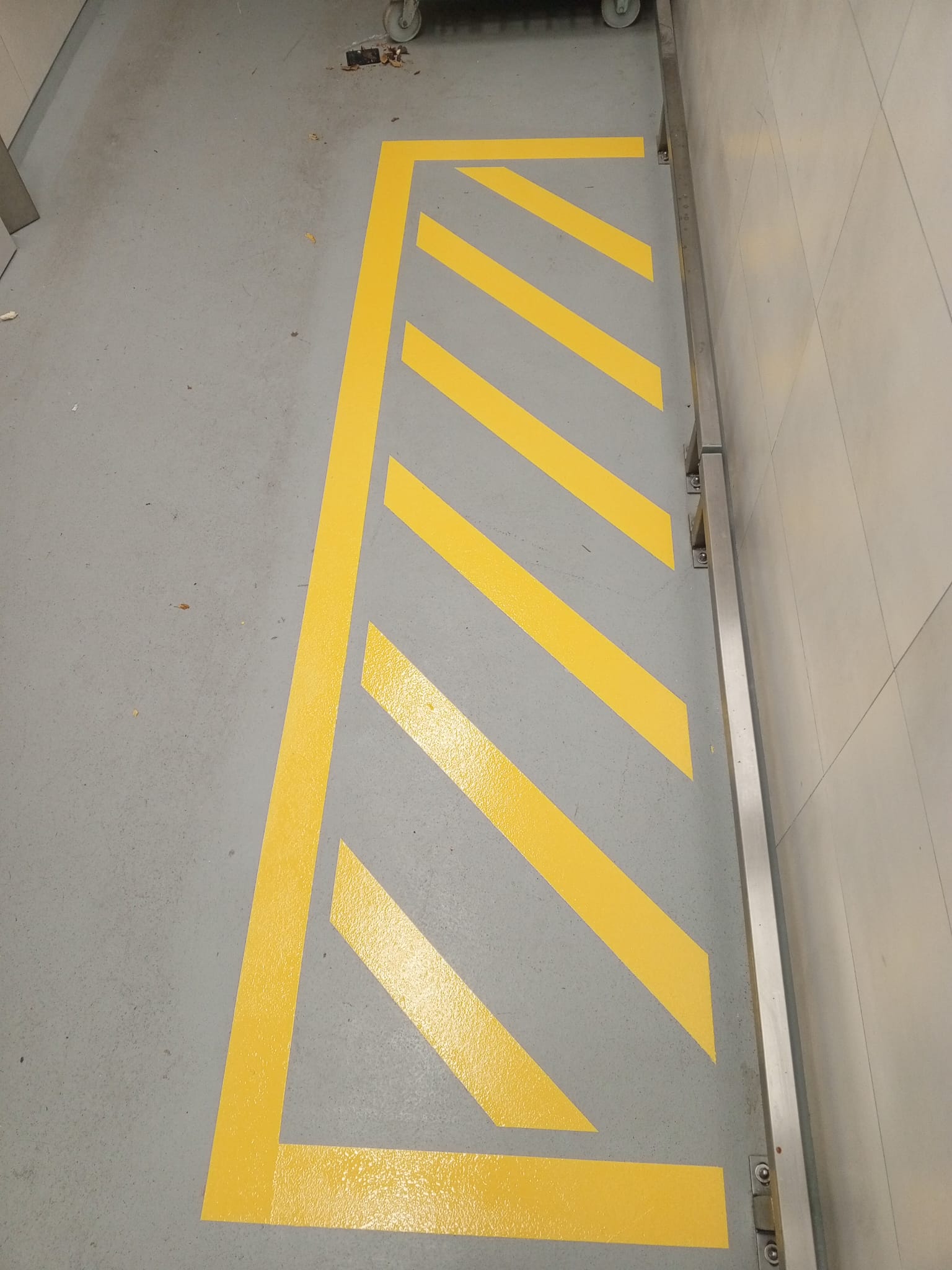 Riesige Sperrfläche soll Staplerfahrern aufzeigen, wie weit sie fahren dürfen.