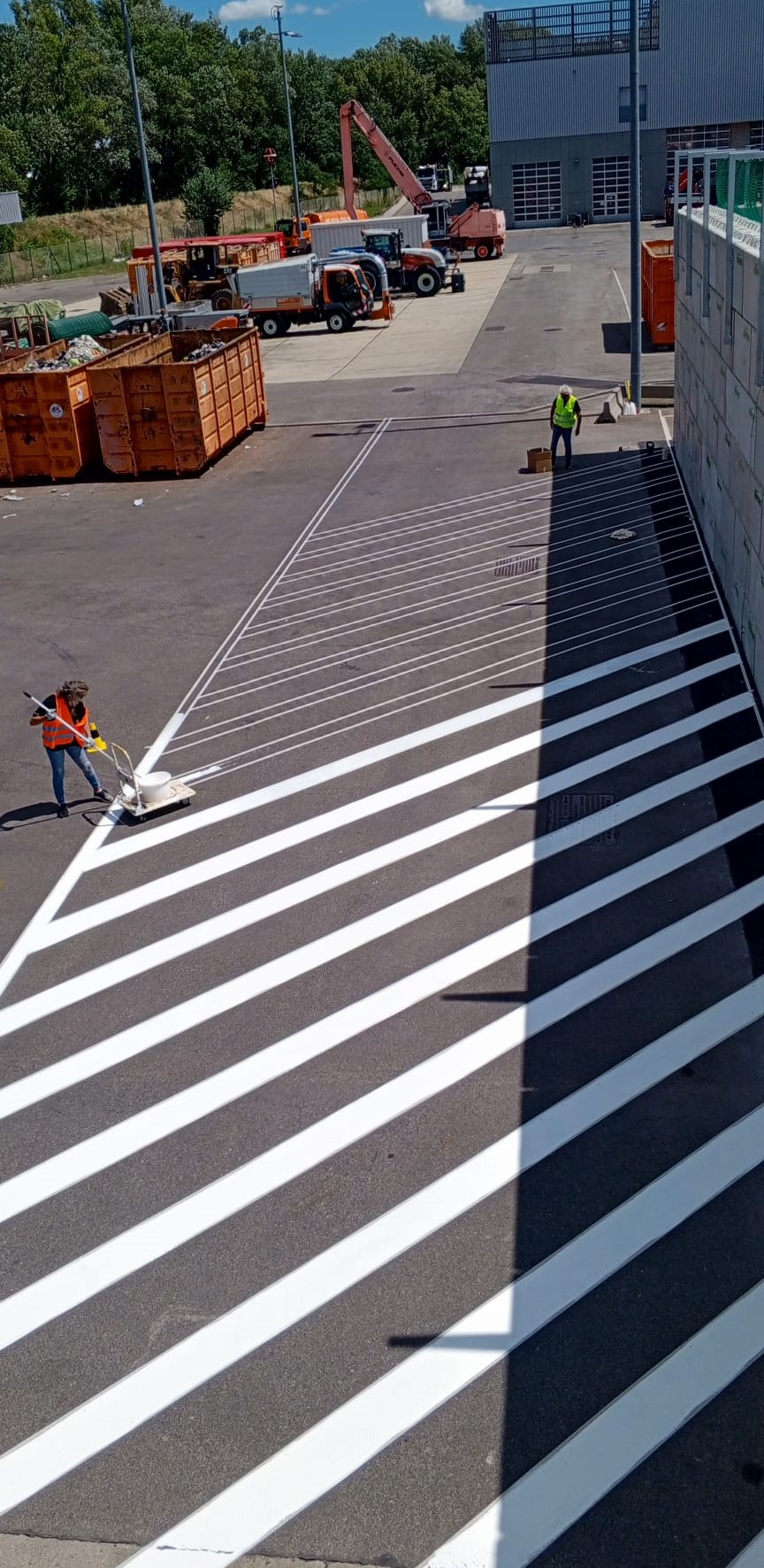Abklebearbeiten von geraden 10cm Begrenzungslinien für Parkplätze.